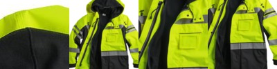 - Removable zip up hooded sweatshirt with two slash pockets and reflective bands on left arm