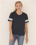 * Dry-Excel(tm) 4.1 ounce 100% polyester wicking horizontal textured stripe knit with high mechanical stretch and snag resistant technology * Wicks moisture * Ladies' fit * Tag-free label * Self-fabric collar * Contrast color inserts * Raglan sleeves * Contoured bottom