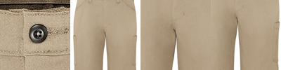 - Two slack-style front pockets, two set-in hip pockets, and left pocket with button closure