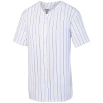 100% polyester smooth pinstripe knit * Wicks moisture * Tagless label * Full-button jersey * Buttons spaced for easy embellishment * Set-in sleeves * Fishtail bottom