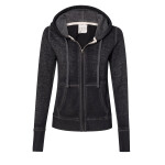 J-America Ladies 7.0 Ounce Zen Full Zip Hoody. 7.0 ounce 55/45% cotton/polyester burnout fabric. Acid washed with silicone finish. Antique brass concealed zipper. Flatlock stitching details throughout. Dyed to match drawcords. Extra long cuff length.