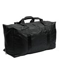 Liberty Bags 600 Denier Explorer Large Fancy Duffel Bag. Multi pocket duffel with U-shaped opening in main compartment. 2 large side pockets with zipped down feature for easy packing and access. Adjustable/detachable padded shoulder strap and large gusset front pocket for additional storage. Black contrasting webbing, quick close feature handles. 600 denier polyester. Non-branded label/tag. 27 x 13 x 14.
