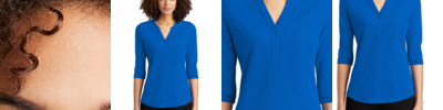 92% polyester/8% spandex wicking pinhole mesh * Wicks moisture * Ladies' fit * Tag-free label * V-neck collar * Contrast color inserts